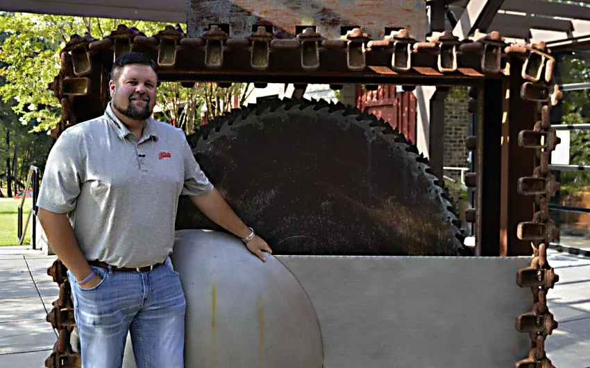 Pictured Above: New Columbia School District Board of Trustees member Eric Lucas of Jones Lumber Company stands with a sculpture made from items from a sawmill at Jones Companies on U.S. 98. | Photo by Joshua Campbell