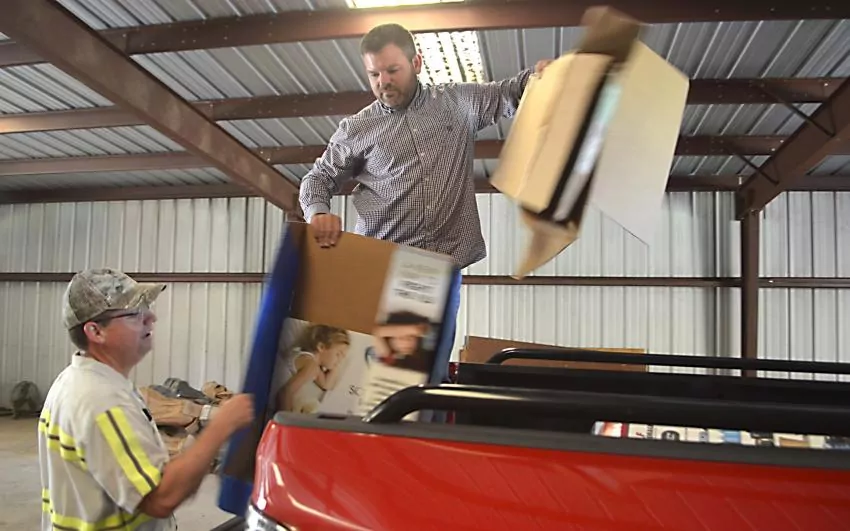 Pictured Above: Kevin Scarborough helps Mayor Justin McKenzie unload cardboard at the recycling center. | Photo by Mark Rogers