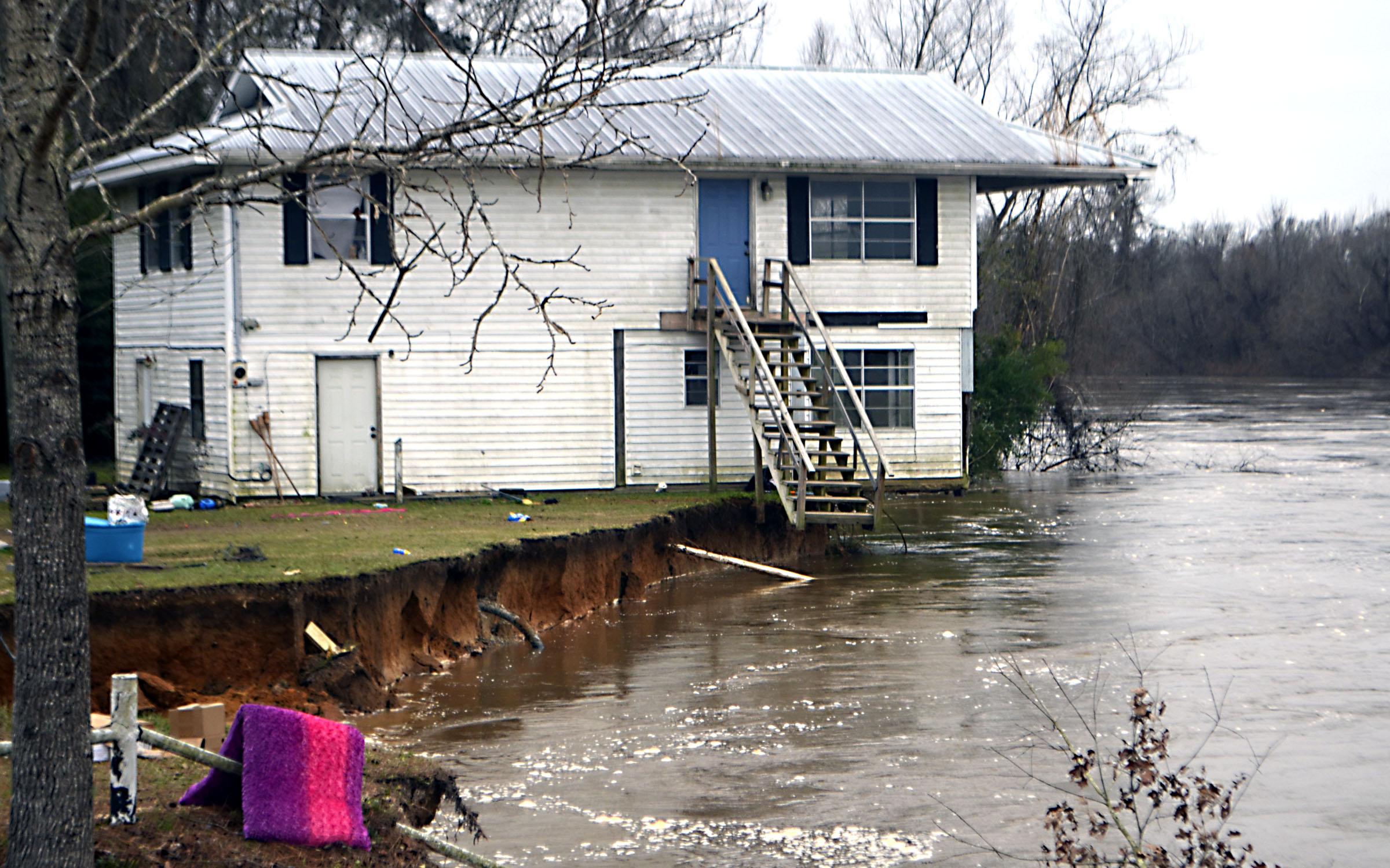 Pictured Above: A home in Riverview Estates off Mississippi 43 South dangles over the Pearl River Monday after high waters caused the land underneath it to erode. A trailer nearby was swept into the flooded river on Sunday. The Pearl crested at 3 feet above flood stage. | Photo by Mark Rogers