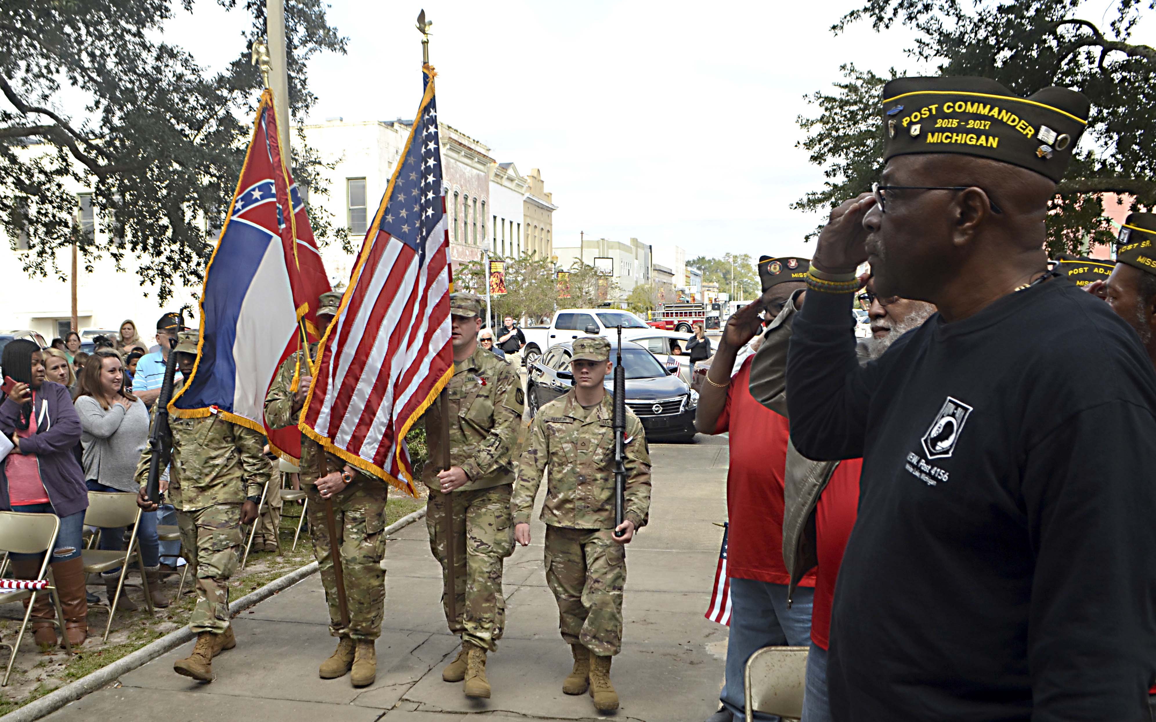 Pictured Above: | Members of the 155th Armored Combat Team of the Mississippi National Guard bring the state and United States flag to the podium Monday during the annual Veterans Day program on the Marion County courthouse lawn. | Photo by Mark Rogers