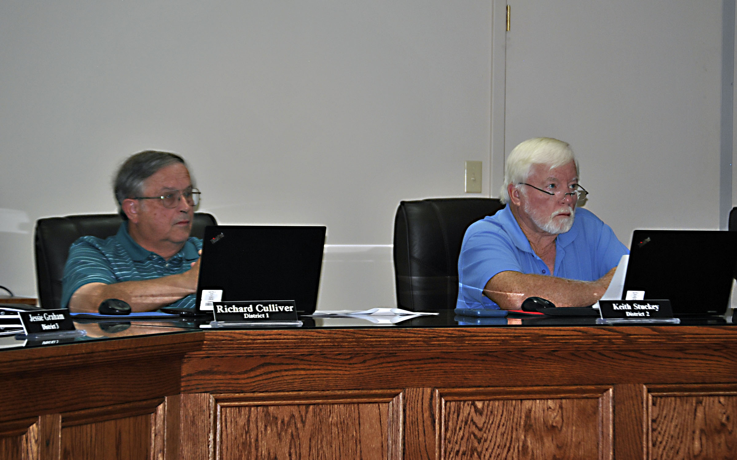 Pictured Above: Marion County School Board members Richard Culliver, left, and Keith Stuckey listen Monday as Superintendent Wendy Bracey gives an update on the third-grade gate. Only 12 students remain in the district who have not passed the test, and they’ll have one more shot this summer. | Photo by Susan Amundson