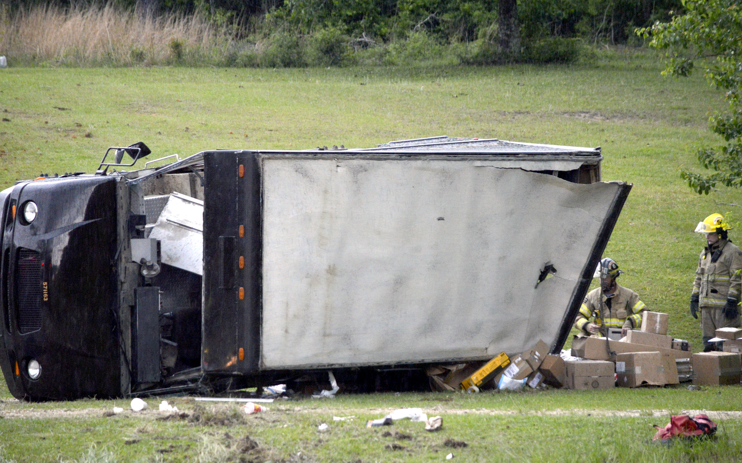 Pictured Above: Members of the Tri-Community Fire Department sort through packages left behind by an overturned UPS truck Thursday afternoon. The truck collided with an 18-wheeler on U.S. 98, and the driver, Christopher Magee, 41, of Hattiesburg, was entrapped before being extricated and taken to Forrest General Hospital for treatment. | Photo by Joshua Campbell