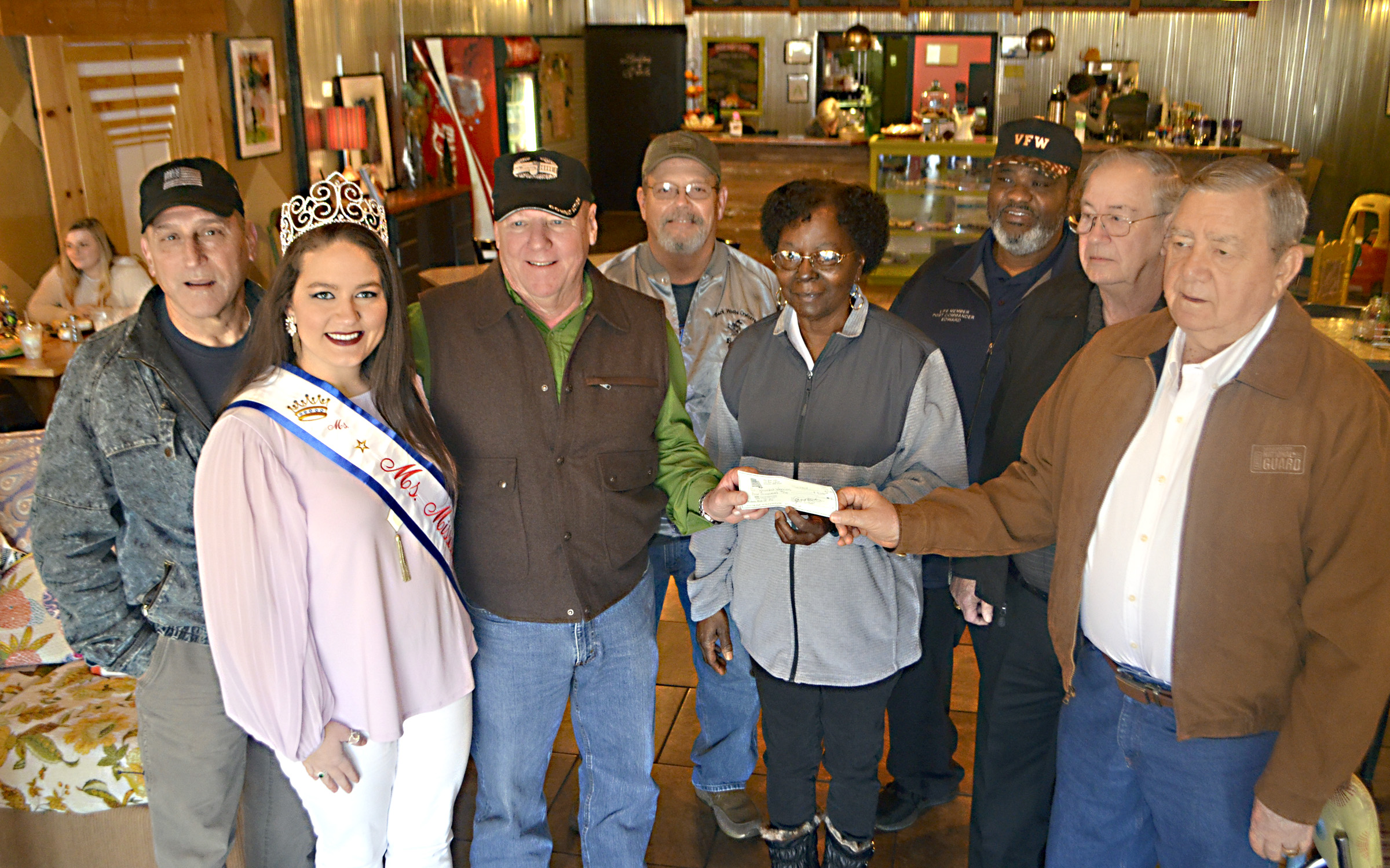 Pictured Above: The Wounded Minutemen of Mississippi were the beneificiaries of a check from the annual Veterans Picnic and Car Show in Columbia. Pictured from left are Picnic Chairman Mark Retcho, Miss Mississippi Coed Danielle Moore, retired Gen. Johnny M. Sellers, Mattie Corker of VFW Post 5393 and retired Gen. Ike Pylant. In back from left are Bobby Rayborn of the Backwoods Cruizers, VFW Post 5393 Commander Edward Corker and Marion County Veterans Service Officer Dewey Blansett. | Photo by Mark Rogers