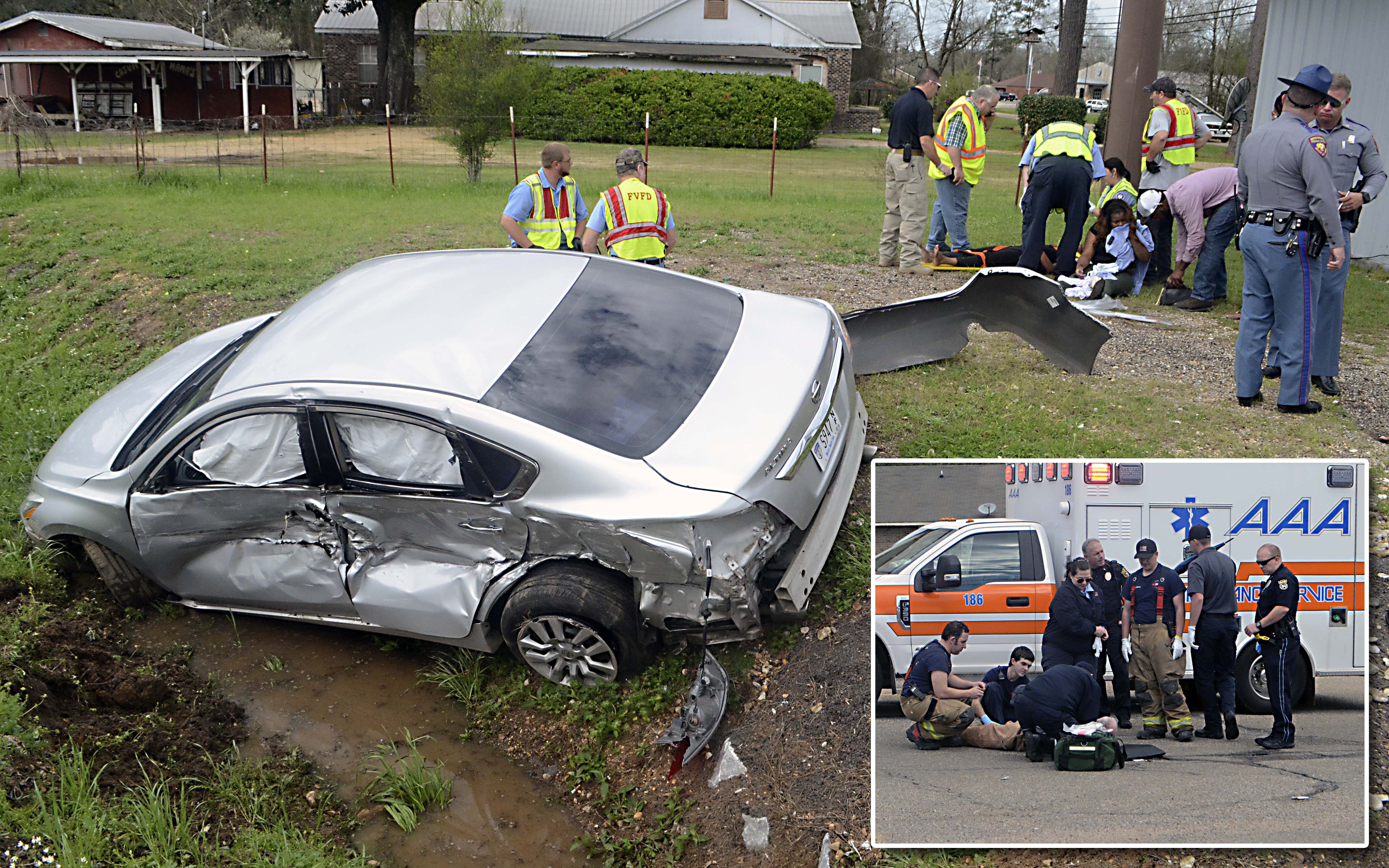 Pictured Above: Above, first responders aid people injured Tuesday in a wreck near Cox’s Triangle in Foxworth. Inset, Chris Pennington is treated in the Fred’s parking lot in Columbia Tuesday after a car backed into his motorized scooter. | Photo by Mark Rogers