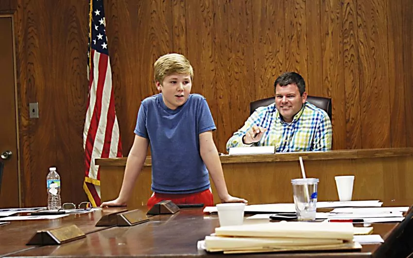 Pictured Above: Myles Clark discusses his ideas for a skate park with Columbia aldermen Tuesday as Mayor Justin McKenzie watches in amusement. The 11-year-old took the initiative on his own to meet with the board and made a smooth presentation. | Photo by Charlie Smith