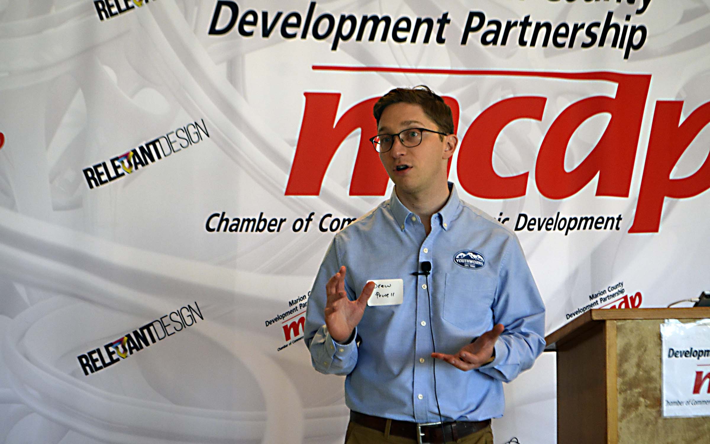 Pictured Above: Columbia native Drew Powell recently spoke to attendees at the Marion County Development Partnership’s Catchy Friday breakfast about Youthworks. | Photo by Mark Rogers