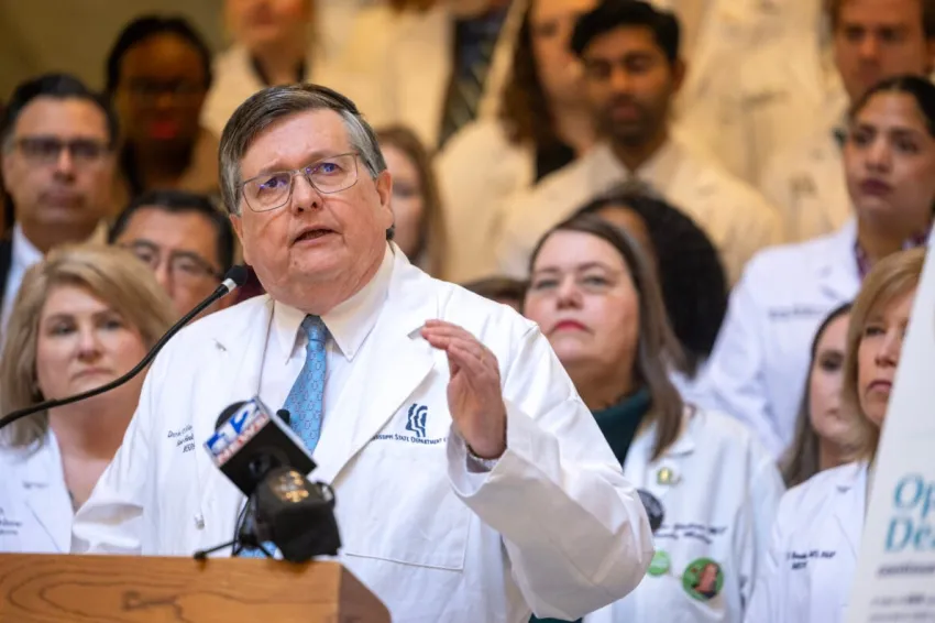 Brittany Denson, Save a Life Day state co-coordinator and organizer for Hinds County, with other volunteers, passes out naxolone and related items including these banana post cards, at St. Luke's United Methodist Church, Thursday, Sept. 25, 2025 in Jackson. Credit: Vickie D. King/Mississippi Today