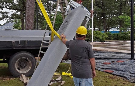 The largest pieces of granite came from Southern Monument’s supplier in Georgia. The supplier has a quarry that can cut the pieces directly from the ground. The columns are 8-feet, 6-inches long and weigh 3,000 pounds each. The larger pieces on the top and bottom of the monument weigh 2,800 pounds, and the other pieces weigh 1,900 pounds.