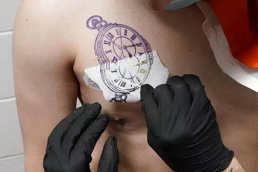 In another tattoo session, Tom Begley traced a new image over a scar on Marinez’s chest from when he was shot last year at a stoplight.