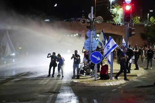 Tensions over the legal plan spiked again late Sunday, as protesters waving Israeli flags blocked roads in Jerusalem, with police using water cannon to disperse them.