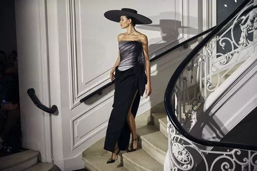 Ultra-wide brim hats stole the show in black, royal blue and bright red. There was plenty of sparkle, and an asymmetrical set of huge tiered ruffle bell sleeves on one high-neck evening dress in white. One sleeve started at the shoulder and the other at the elbow.