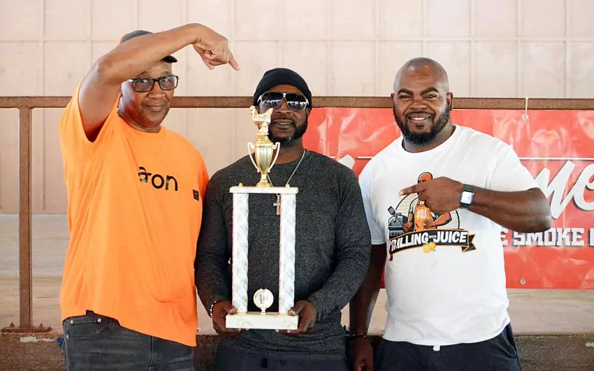 Pastor Donald Aaron, left, and Otis Smith, right, point to Shaun Magee, who won first place in the canned chicken New Harvest Worship Center Annual Smoke-Off Competition at the Columbia Water Park Nov. 4. Aaron, who was also the organizer of the event, placed second, and Smith placed third.
