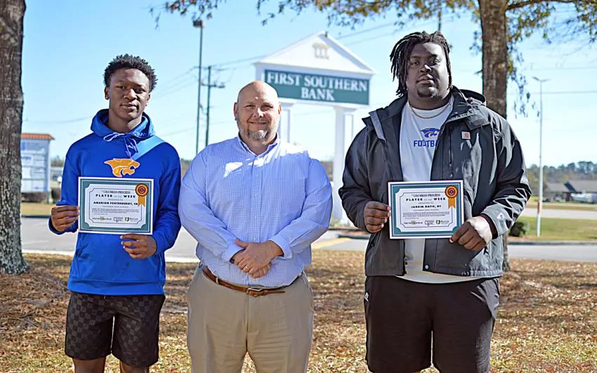 Week 16 Players of the Week are pictured with First Southern Bank CEO and President Scott Davis, center. They are, from left, Columbia’s Amarion Fortenberry and Jaheim Oatis. Not pictured is Will McLendon. Players of the Week are sponsored by Citizens Bank, First Southern Bank and Marion General Hospital.