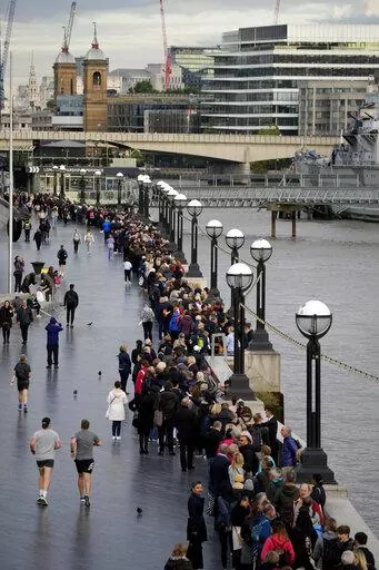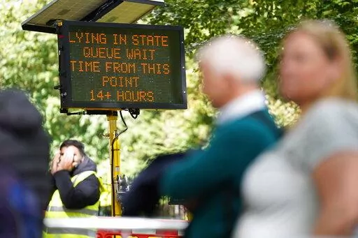 LONDON — Thousands of mourners are standing in line for at least 14 hours to see Queen Elizabeth II’s coffin while she lies in state in London.
