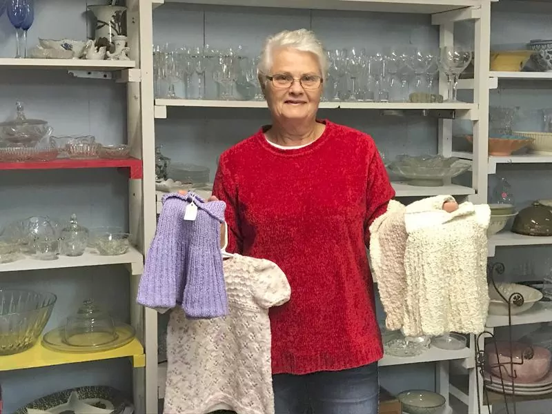 Payne said she loves bidding on storage units and has been collecting since she was a teenager. The inventory at Broken Pots is indicative of that with myriad items available. They include dishes, glassware, books, pots, wall décor, painting, blankets, quilts, clothes and jewelry of all kinds. She even has hand-knitted clothing for children that she made herself. Payne is also starting to move in a lot of her Christmas inventory, which includes both gifts and decorations.