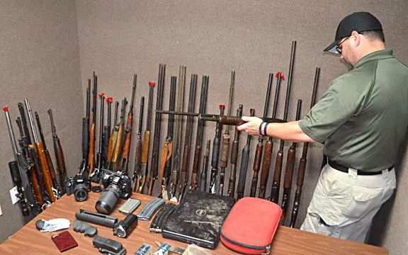 Caption: Marion County Sheriff’s Office Investigator Matt Brown on Thursday looks over some of the 35 stolen guns that were recovered in Claiborne County this week. The guns were allegedly taken from a Kokomo residence in a burglary Sunday. Two people have been charged in the case.