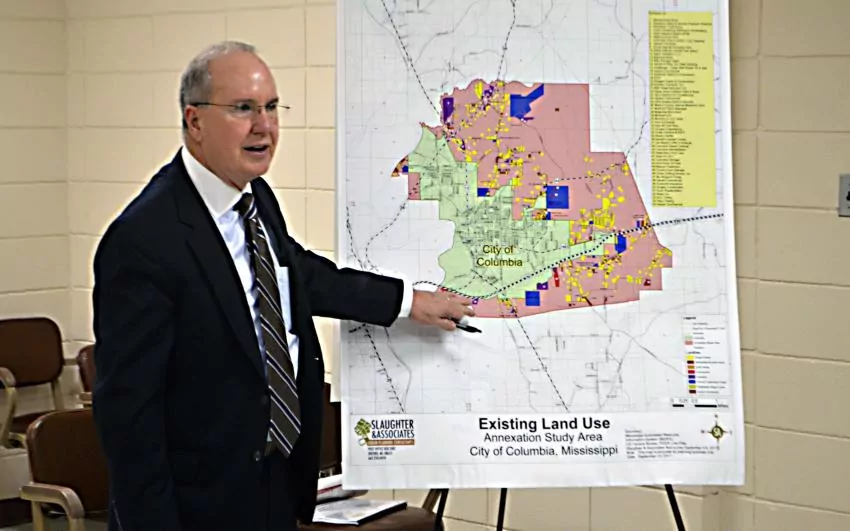 Pictured Above: Mike Slaughter of Slaughter and Associates talks Wednesday about the annexation study his firm has been working with Columbia officials to complete. | Photo by Mark Rogers