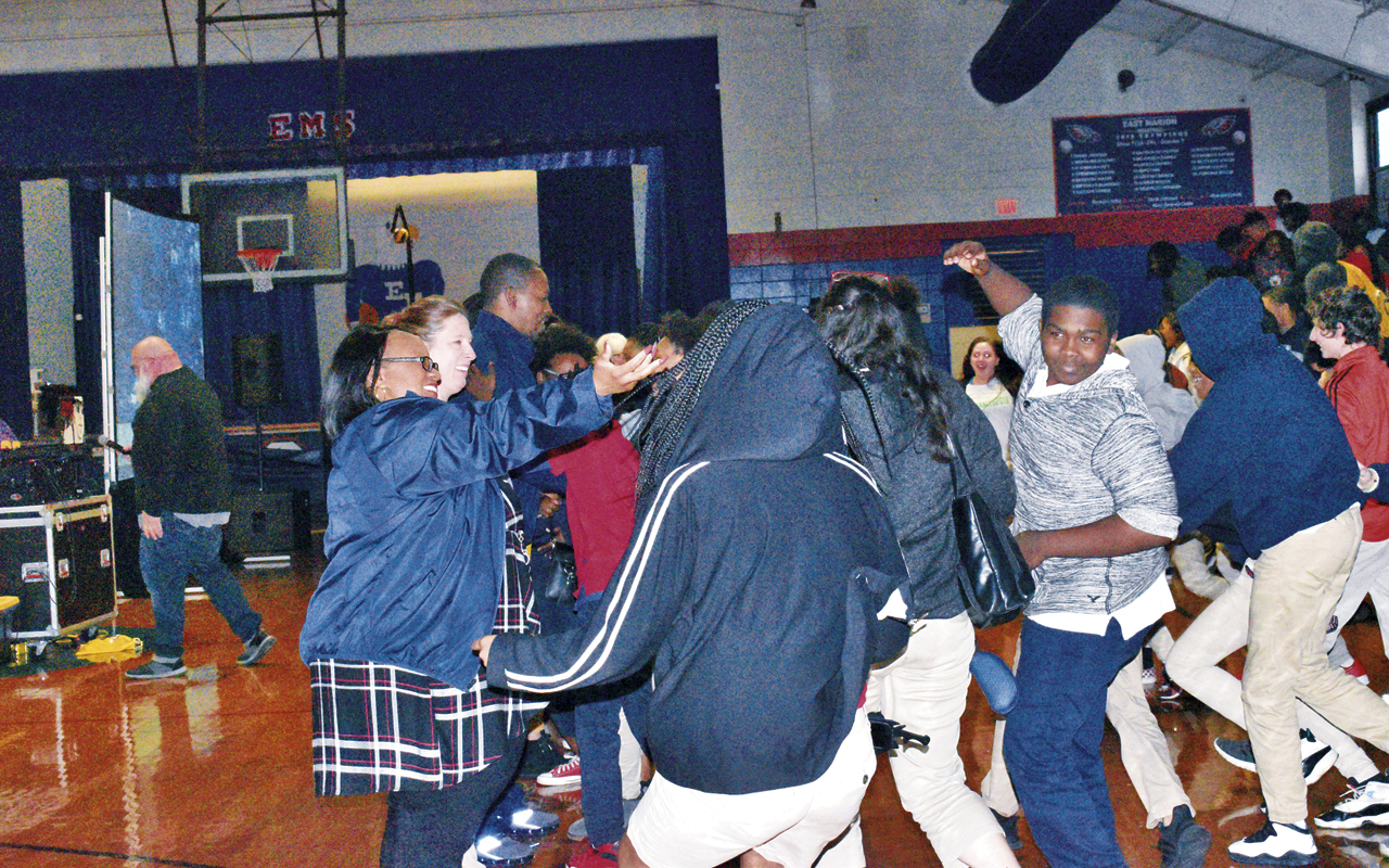 The program Monday at East Marion began with hip-hop artist DJ Cadillac, otherwise known as Bo Trebotich of Jackson, to the delight of the students. He described how he started off as a young man who had a bright future all lined up, a future that included a full scholarship to play college sports.
