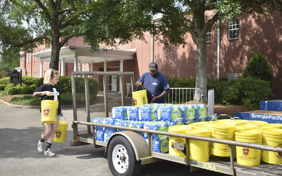 The regional distribution center has been set up at First Baptist Church. People may drop off donations, those in need of assistance may get supplies and throughout the day supplies are also being taken to both Hurricane Creek Baptist Church and Pine Burr Baptist Church to be dispersed from there.