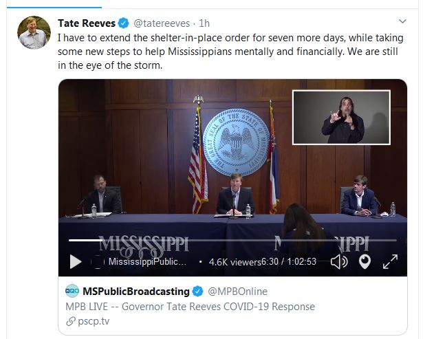 This morning Gov. Tate Reeves announced Mississippi's shelter-in-place order will continue for seven more days, although some of the restrictions will be softened beginning Monday.