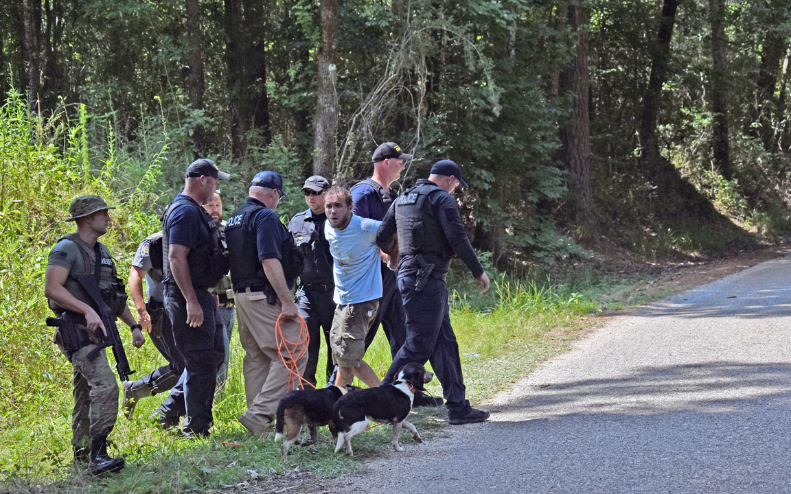Caption: Law enforcement officers bring Kelby Glenn Jordan out of the woods in the Expose community shortly before noon today following a manhunt. Photo by Susan Amundson