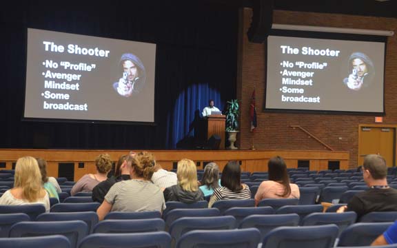 Clayton discussed a variety of tactics designed to keep casualties to a minimum in a situation that may involve a gunman, from locking classroom doors to quick responses in calling 911. He showed a film about a gunman in the workplace for the school personnel.