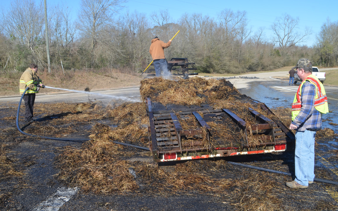 Greer said three members of his office helped battle the blaze, himself, Deputy Director Cindy Williamson and Communications Officer John Bowman. Greer did not have information on the driver and passenger of the vehicle. No injuries were reported and the truck that was hauling the hay was not damaged.