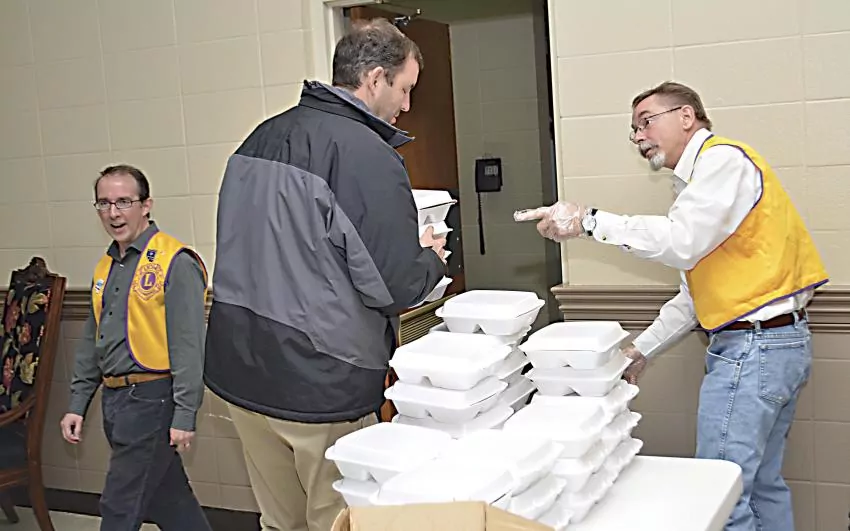 Pictured Above: Dave Lee, left, and Ken Knopp, right, help Jeff Dungan with his carryout plates at a previous event. | File Photo