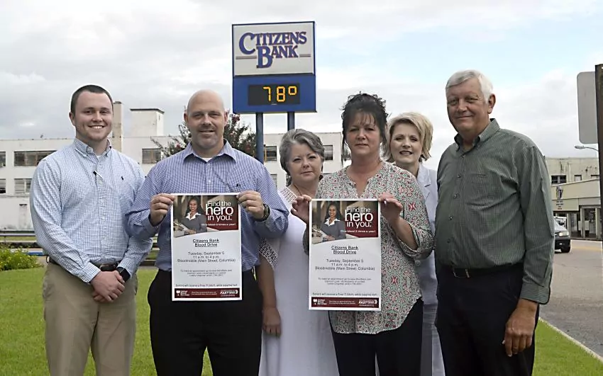 Pictured Above: Promoting the blood drive at Citizens Bank are, from left, Cole Oglesbee, Matt Rayborn, Rechele Watts, Vonda Blackwell, Leitha Chapman and John Pounds. | Photo by Mark Rogers