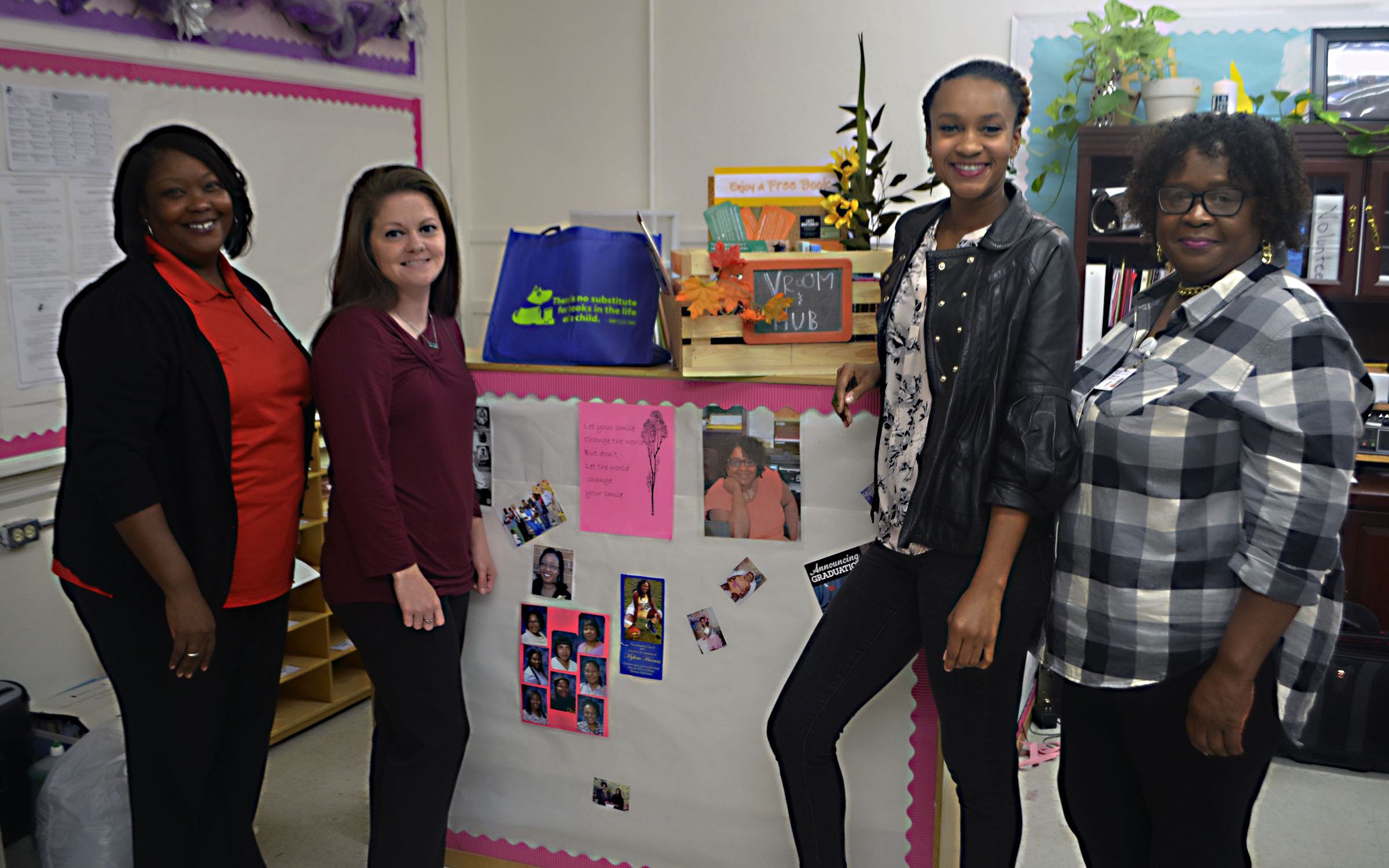 Pictured Above: Pictured with a Vroom crate at the Hub Head Start Center are, from left, Yolanda Minor, program specialist for Save the Children, Marley Mansfield of the Columbia-Marion County Public Library, Lacey Montgomery, kindergarten readiness ambassador for Vroom and community ambassador for Save the Children, and Sandra Hilbert, center administrator for Hub Head Start. | Photo by Mark Rogers