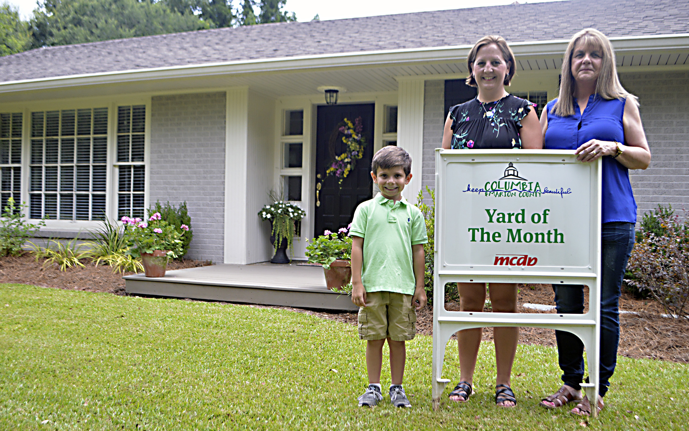 Pictured Above: Katie Broom and her son Mason are pictured with Deborah King, right, of the Golden Acres Hilltop Garden Club at the Broom house at 1402 Broad St. Not pictured is her other son, Trent Broom. | Photo by Joshua Campbell