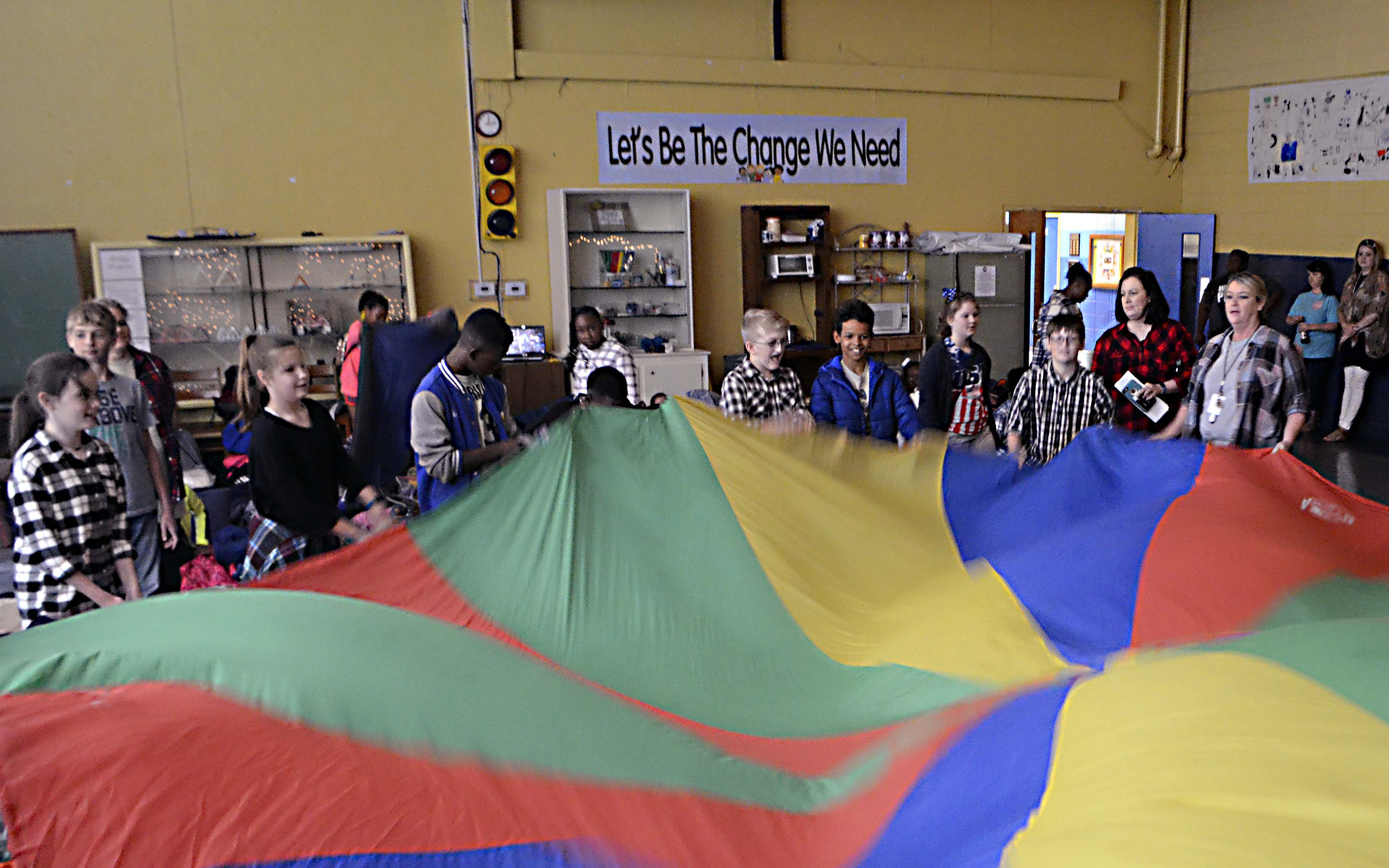 Pictured Above: Columbia Elementary School students enjoy a game using a parachute at the CES Campout party. | Photo by Mark Rogers