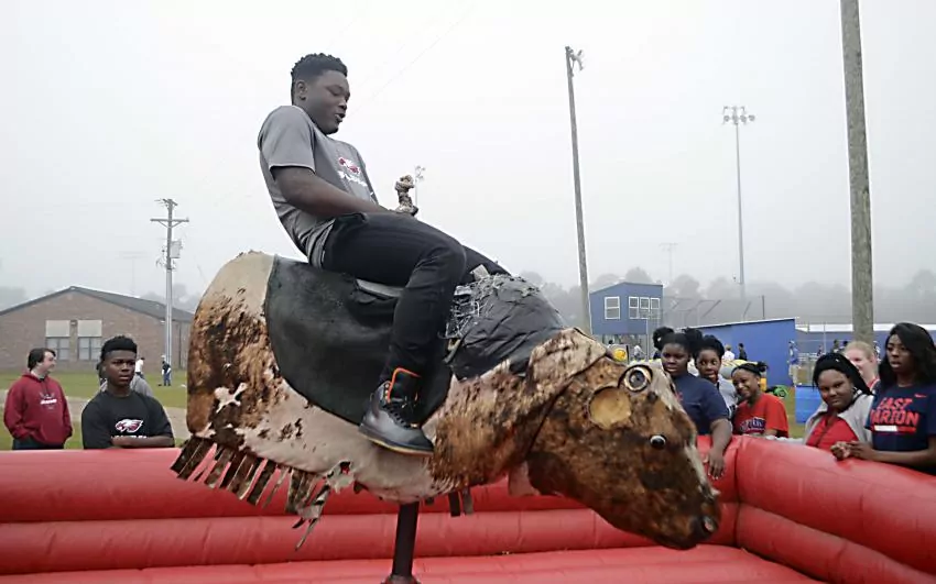 Pictured above: Eighth grader J.T. Jones rides a mechanical bull Nov. 16 at East Marion High School’s Funtastic celebration. | Photo by Charlie Smith