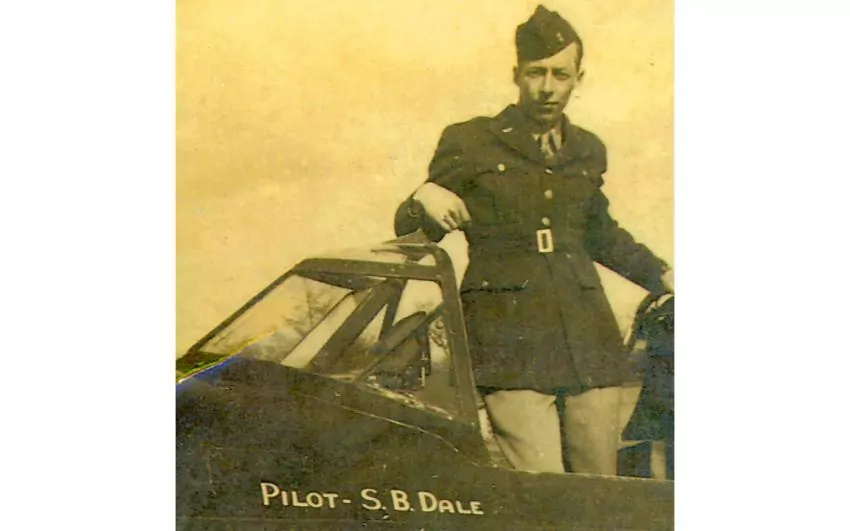 The yellowed picture shows a young man standing in the cockpit of a plane, leaning on the windshield. On his face is a focused, confident look, the hallmark of a military aviator. Written on the side is “Pilot – S.B. Dale.”