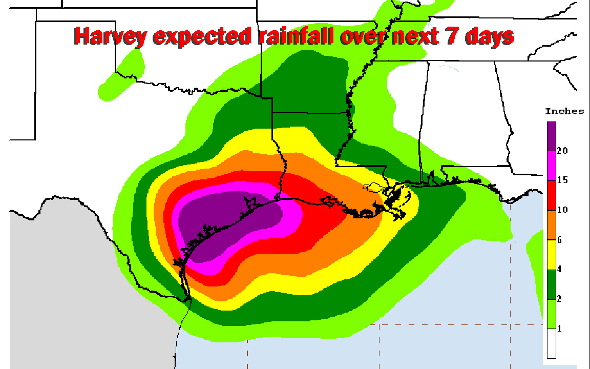 Map: This map from the National Weather Service shows the expected rainfall from Hurricane Harvey over the next seven days.