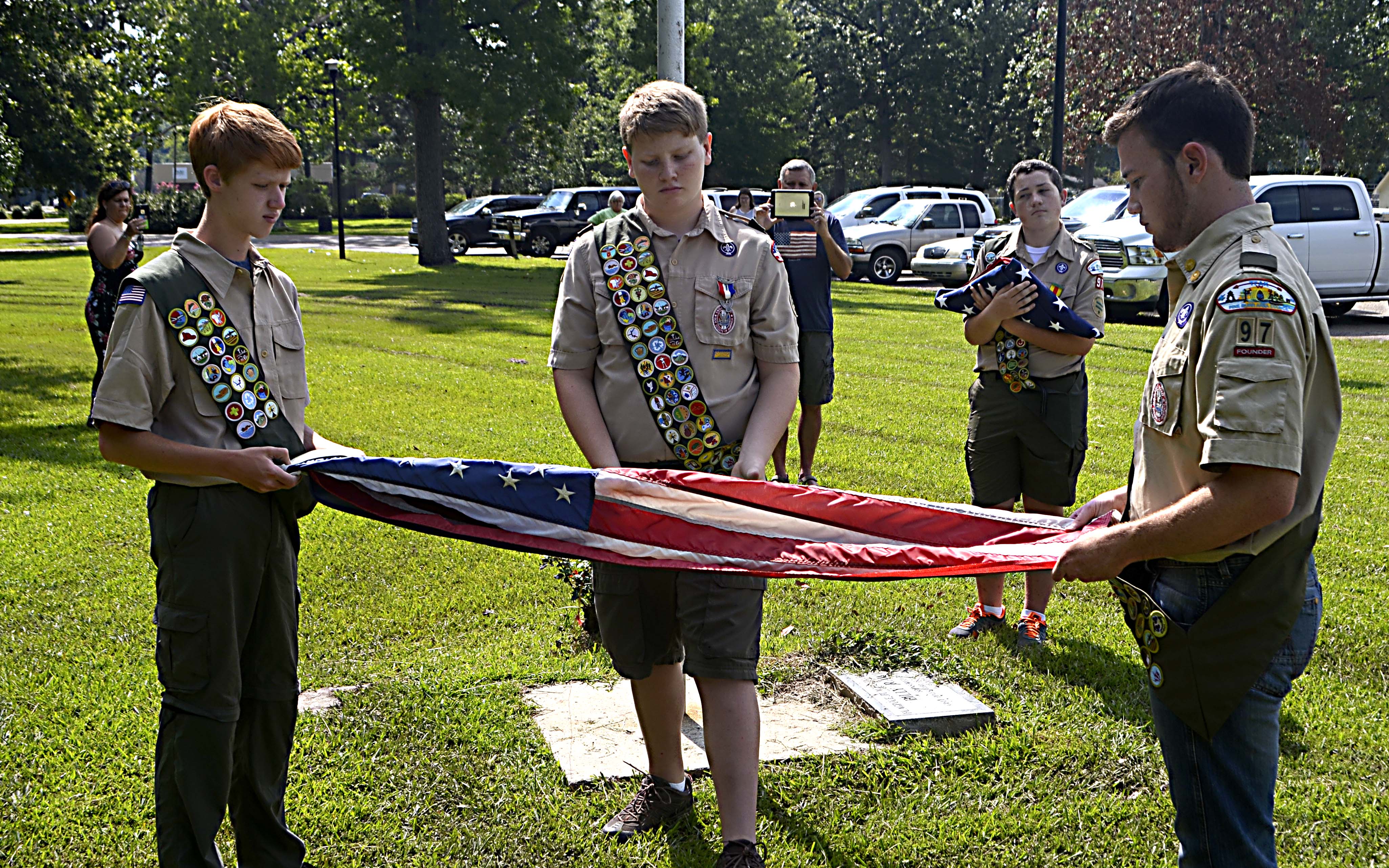 Pictured Above: Members of Boy Scouts Troop 97 unfurl a new flag dedicated in honor of Caleb Coleman. | Photo by Mark Rogers