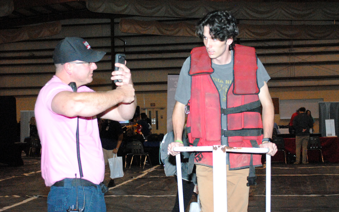 Columbia fireman Steven Bennett had a step climbing machine and a 165-pound dummy at the fire department’s display. Bennett was conducting a couple of the harder endurance tests a potential candidate would face at the fire academy. He was giving students the options of participating.