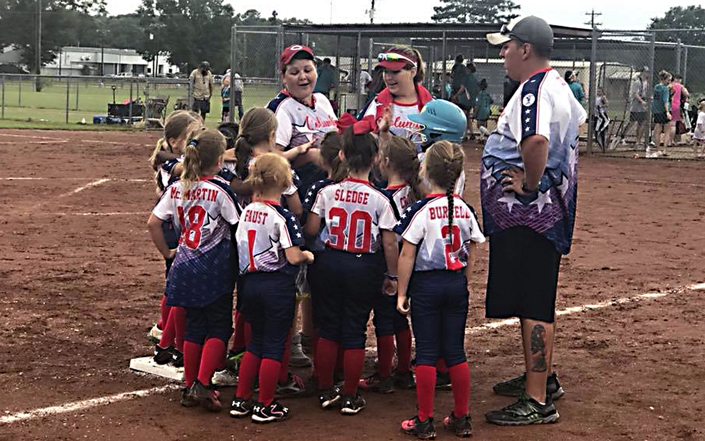Pictured Above: Sweetees coaches rally the troops between innings during the state tournament. | Photo Submitted