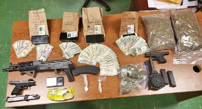 The stop occurred on Broad Street near High School Ave. around 9:41 p.m. Inside the vehicle, the officers discovered more than 2.5 pounds of marijuana, 5.7 grams of methamphetamine, multiple dosage units of Xanax and paraphernalia used for packaging and distributing narcotics, according to Police Chief Michael Kelly. Weapons found included an AK-47 pistol, Glock 27 and a Taurus 9mm pistol.