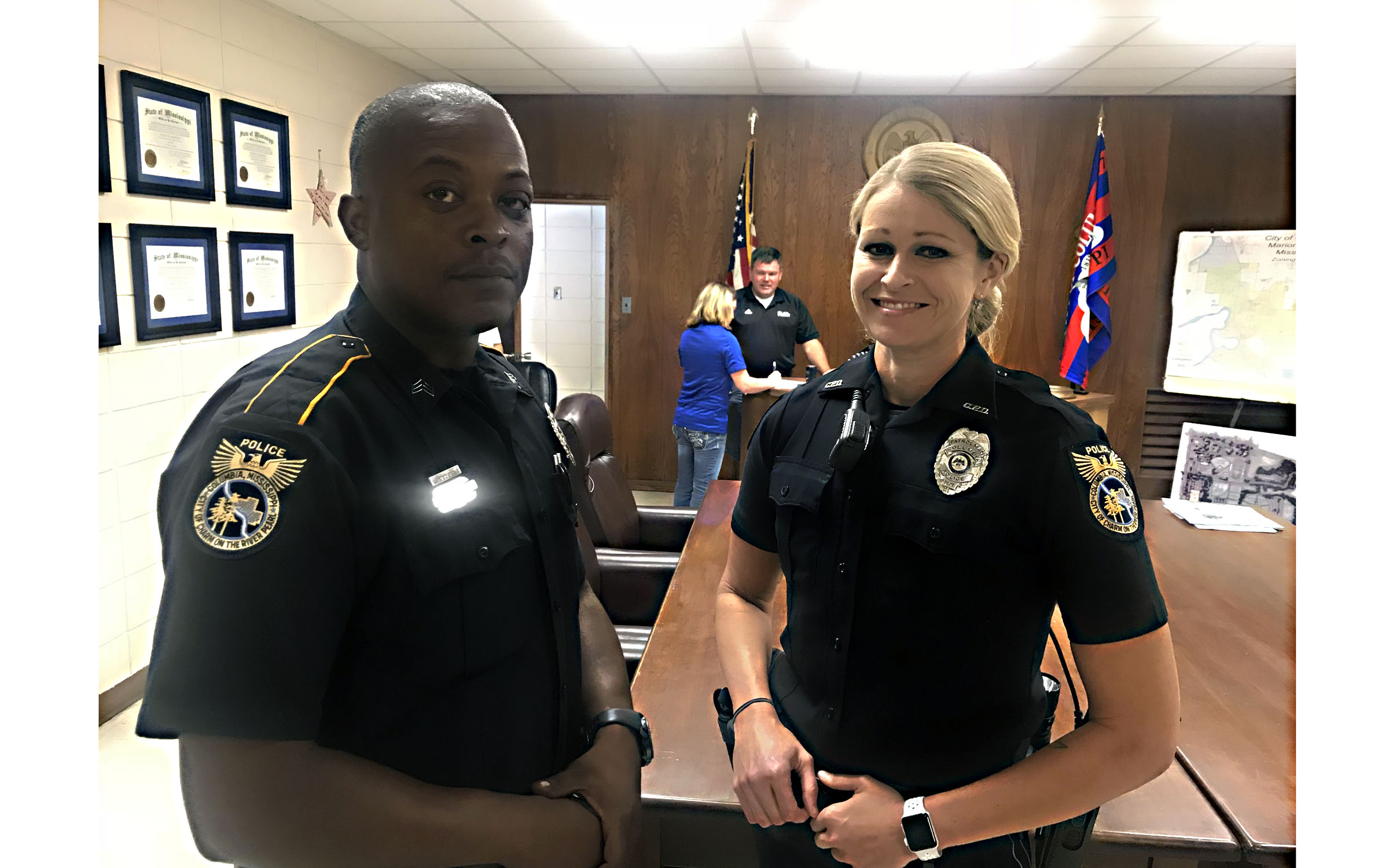 Pictured Above: Sgt. Adrien Fortenberry has a new patrol officer on his shift, Vanessa Tullis, who was hired last week and sworn in on Monday.