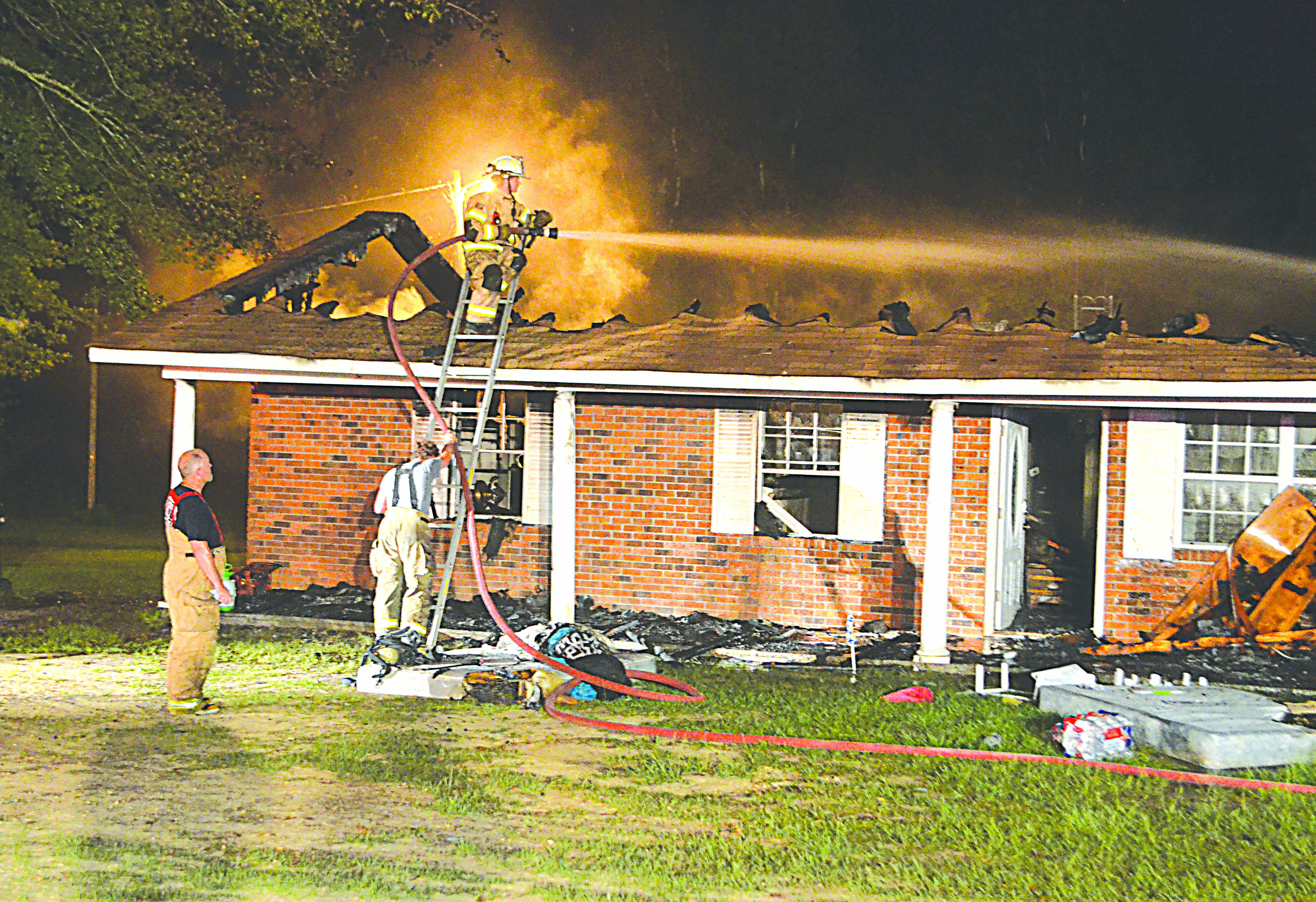 Pictured Above: Tri-Community Volunteer Fire Department firefighters battle the second blaze at a home on Expose Road Monday night. The home was destroyed. | Photo by Mark Rogers