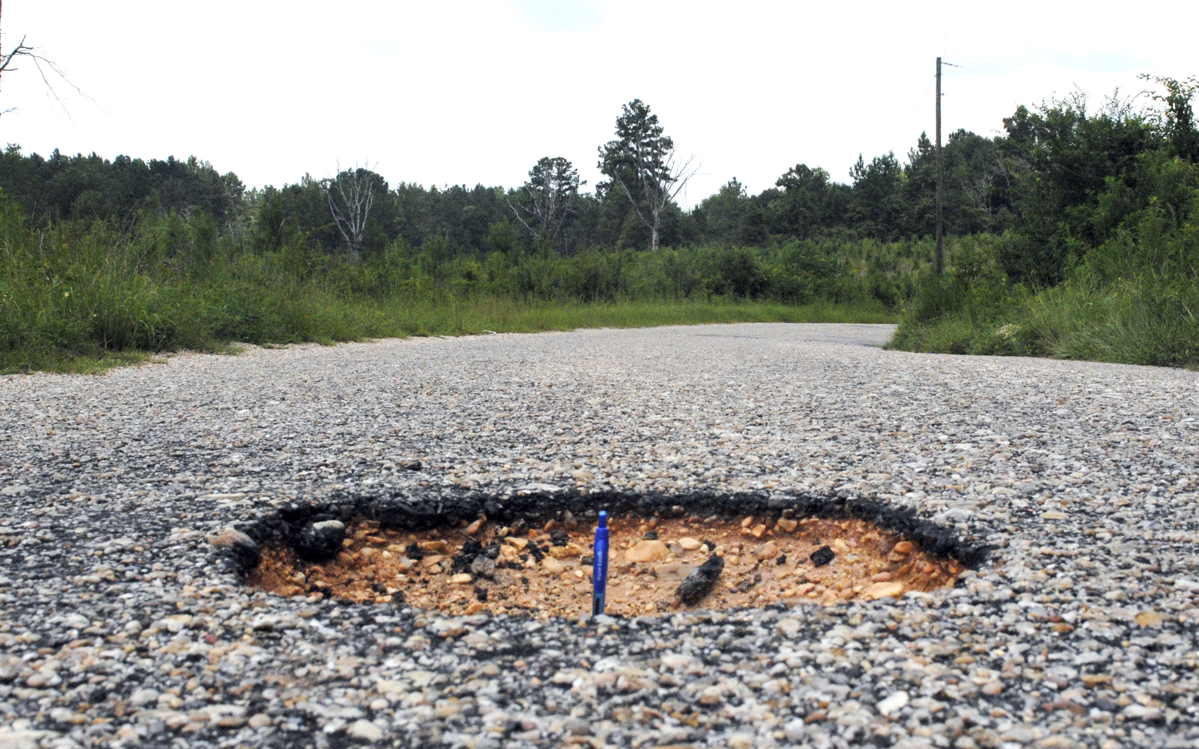 Pictured Above: A pen stuck in a pothole shows its depth Monday on Russell Road. Resident Delores P. Porter presented a petition about road conditions to county supervisors. | Photo by Susan Amundson