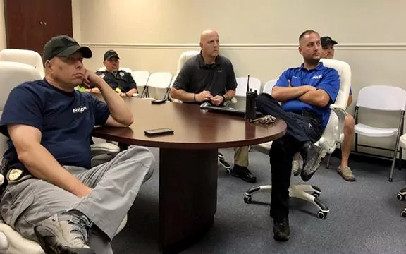 Caption: Marion County officials listen to a weather update Monday morning from the National Weather Service about Tropical Storm Gordon.