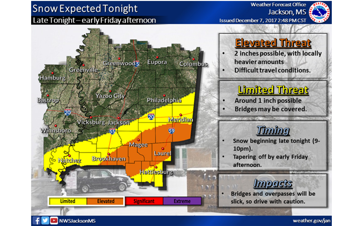 The National Weather Service in Jackson issued a winter storm warning this afternoon that will be in effect from 9 p.m. until noon Friday.
