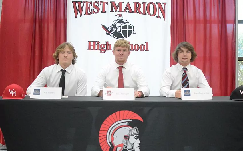 The West Marion baseball team had three seniors sign junior college scholarships in a ceremony held Nov. 3. From left, Nik Carney signed with Southwest Mississippi Community College, Jude Stringer signed with Holmes Community College and Jonathon Miller signed with Southwest Community College. | Photo by Joshua Campbell