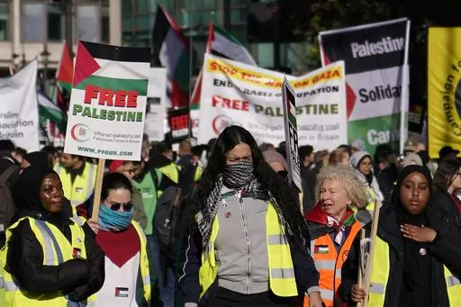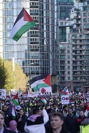 LONDON (AP) — Pro-Palestinian demonstrators marched peacefully through central London on Saturday, even as right-wing counter-protesters clashed with police, after a week of angry debate over whether to permit the event on a day when Britain honored its war dead.