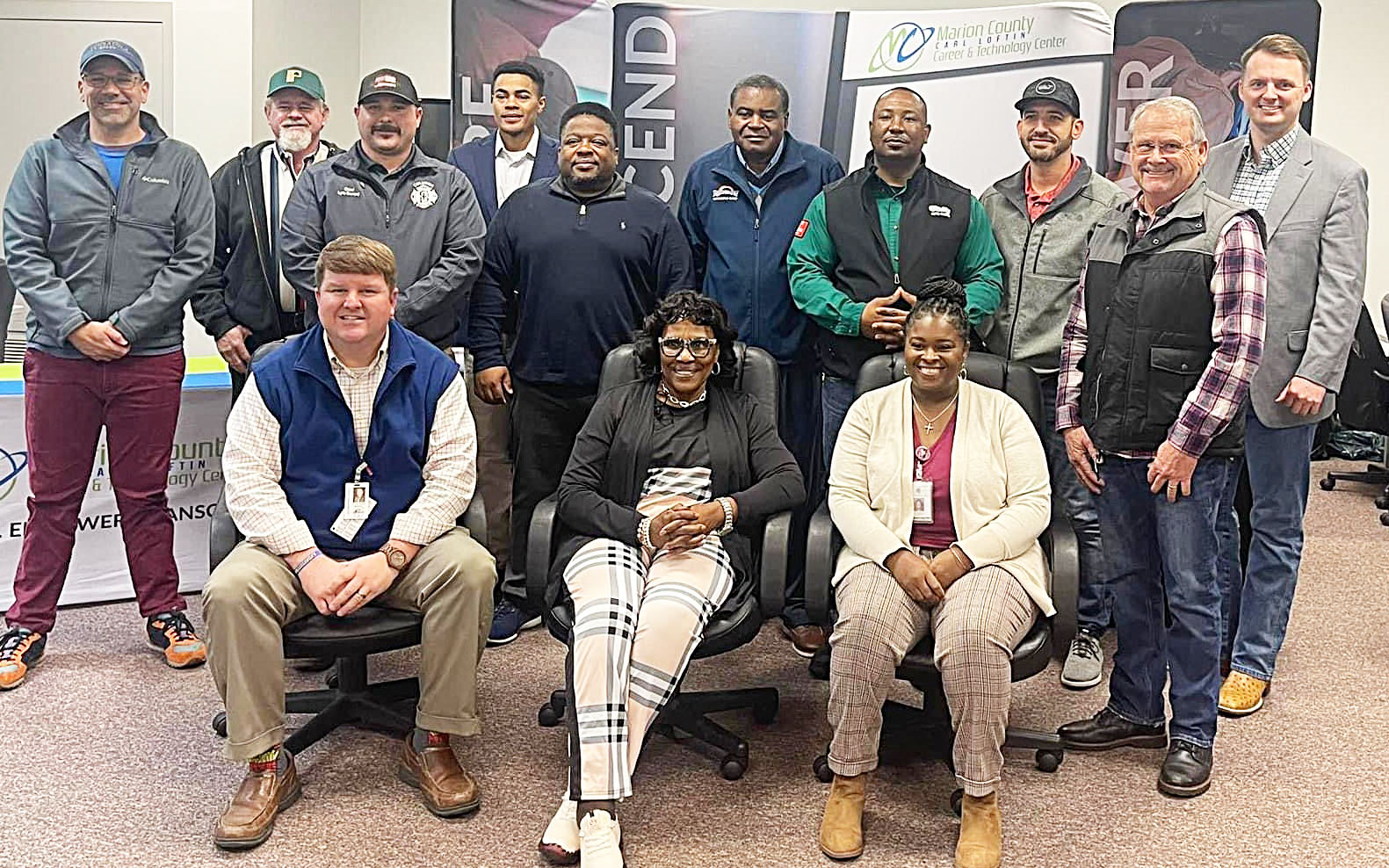 The Marion County Carl Loftin Career and Technology Center hosted its annual “Career and Industry Day'' on Feb. 2. Amy Baughman, student services coordinator, invited community leaders into classrooms to speak to career and technical education students about career and industry updates and personal professional experiences. Front row, from left, are Jay Raybourn, Teacher Academy; Jessie Burns, Health Science; Tyronica Neapollioun, Early Childhood Education; back row, Barrett Round, Culinary Arts; Keith Conerly, Construction; Lyle Berard, Law and Public Safety; Jordan Stewart, Work-Based Learning; Jeffrey Johnson, Engineering/Robotics; Glenn Allen, Automotive Services; Byron Franklin, Automotive Services; Chris Crawford, Digital Media; Kenny Breakfield, Welding; and Kent Saucier, Work- Based Learning. | Photo submitted