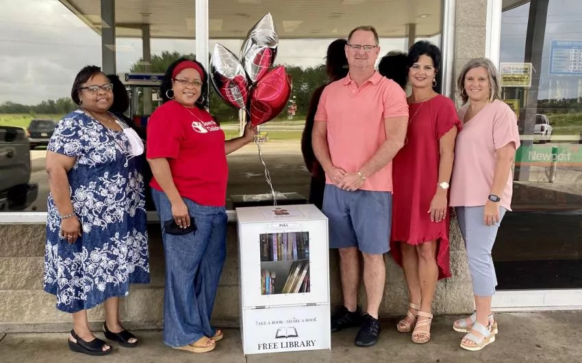 Installing a new book receptacle on Thursday at Reagan's Corner, located at 640 US 98 in Kokomo are, from left, Libby Aaron, assistant superintendent of MCSD, Karen Irvin-Barnes, community engagement coordinator for Save the Children, Stacy Reagan, owner of Reagan's Corner, Vickie Boone, principal of West Marion Primary School, and Traci Sullivan, assistant principal of WMP. | Photo by Danny O'Fallon