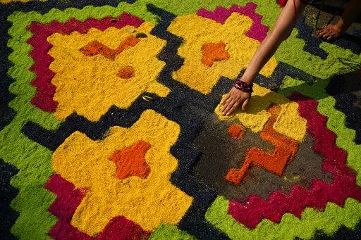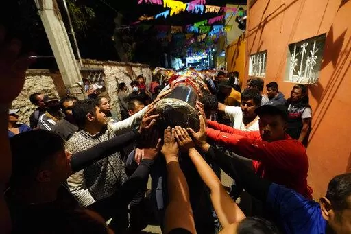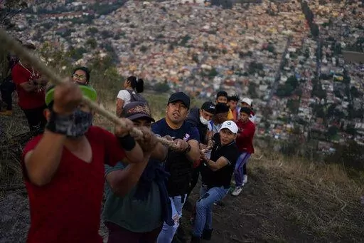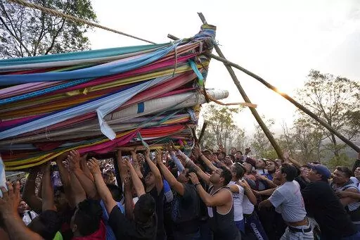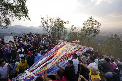 SANTA CRUZ XOCHITEPEC (AP) — Dozens of men strained and struggled as they hefted a huge cross adorned with colorful ribbons and trudged down a steep hill in a yearly ceremony of the Day of the Cross celebrated in the Mexico City neighborhood of Santa Cruz Xochitepec.