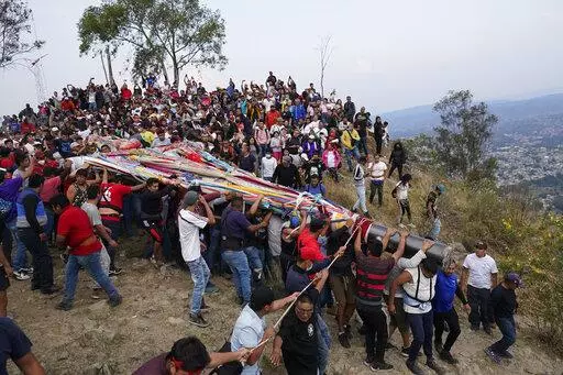 In a babel of voices, and after three failed attempts, dozens of local volunteers known as “cargadores,” or carriers, managed to lower the 23-foot (7-meter) tall cross from its perch and carry it all the way down to the local church.